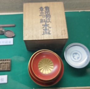 むかしの茶器と並び、菊の紋章の盃が展示されています。