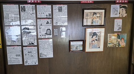 壁一面に、明治時代から、大正、昭和までの宇津救命丸の新聞広告が貼って