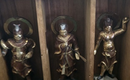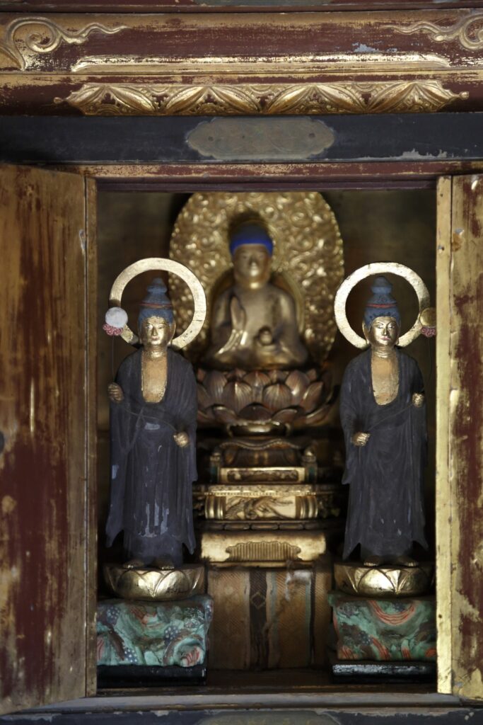 仏壇の中央に薬師如来、右には日光菩薩、左には月光菩薩がいて、薬師三尊像と呼ばれています。