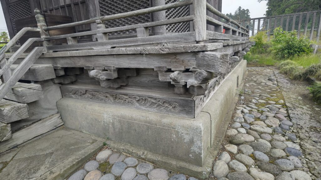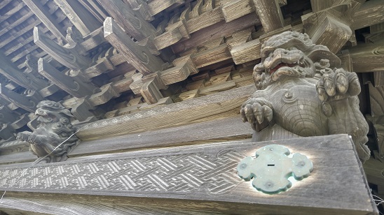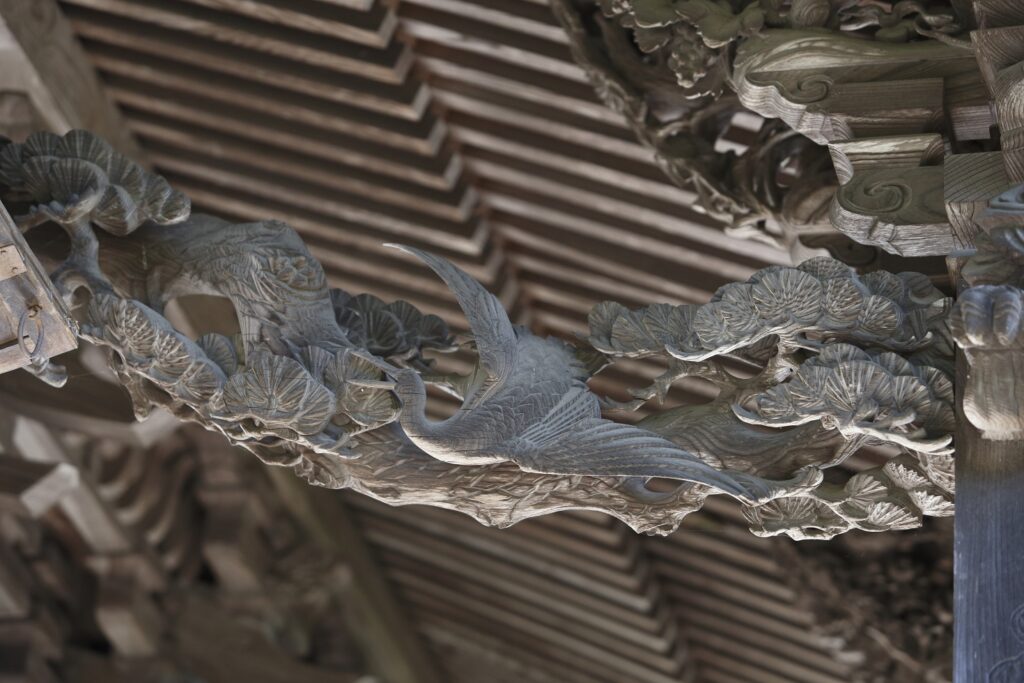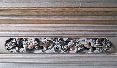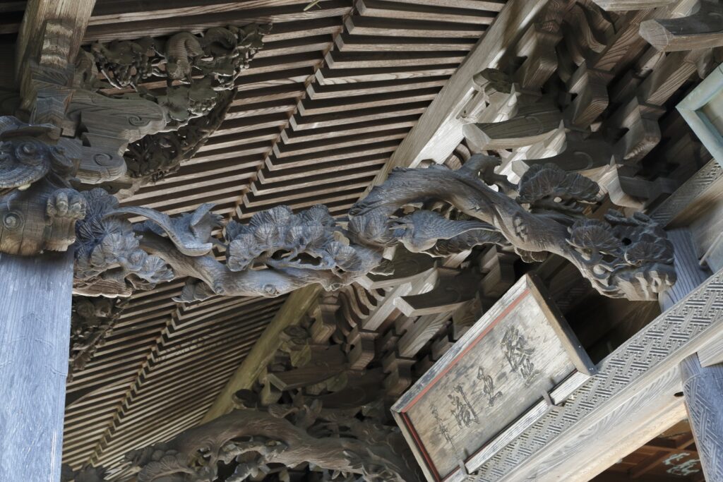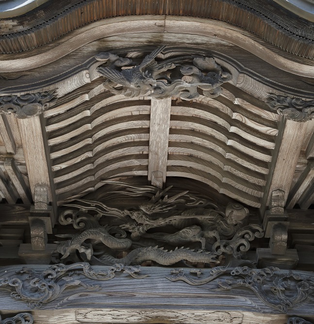 向拝(屋根の中央が張り出した部分)には龍や唐獅子、鶴や松があり、建物の周りにある彫り物の中にはまだ赤や緑の塗料が残っています。