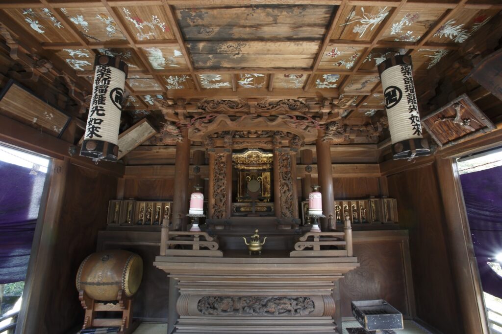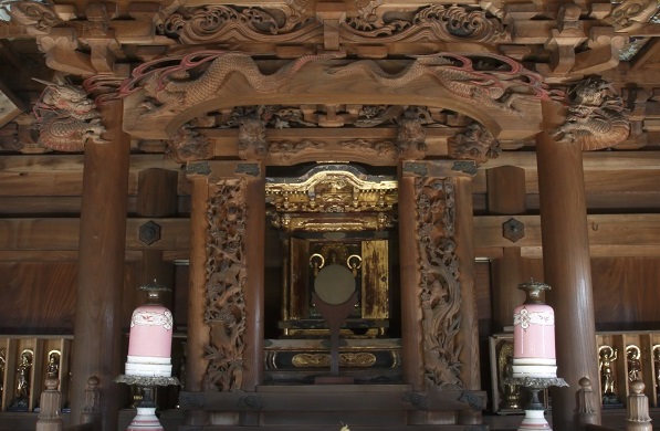 仏壇の上には大きな龍、扉には雀やリスなどの動植物が細かく彫刻されています。