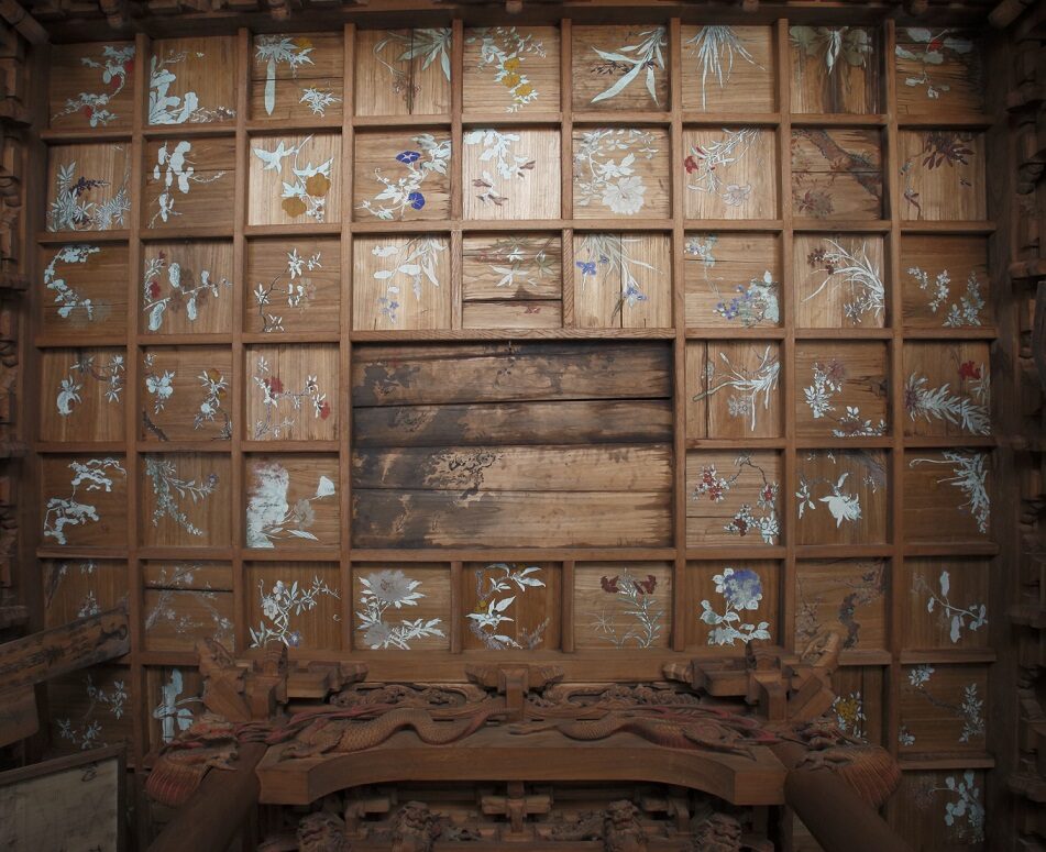天井には、牧野牧陵(江戸時代末期から活躍した下野の南画家)の龍の水墨画を中心に、彩色で59種の花が描かれています。この花の名前については現在調査中ですが、薬草だけでなく、地元の草花も描かれているとのことです。