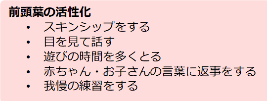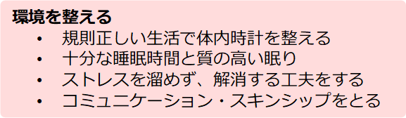 体内時計を整えて、質の高い、十分な睡眠をとれるようにするようにしましょう。また、ストレスをためないように親子のコミュニケーションやスキンシップをすることと、腸内環境を整えることも大切です。腸内環境を整えるというのは、腸の働きが脳に影響するからで、自律神経にも影響を与えます。 自律神経が安定すると、気持ちが落ち着き、睡眠もとれるようになります。