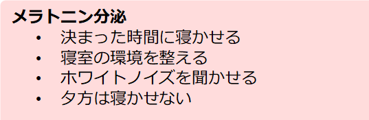 ストレスによる夜泣きやかんむしを根本から改善するには、赤ちゃんの睡眠力をつけること重要が要です。前頭葉の活性化と、メラトニン分泌を意識させていくことで、お子様は深く、長く眠ることが出来、ストレスも緩和されます。