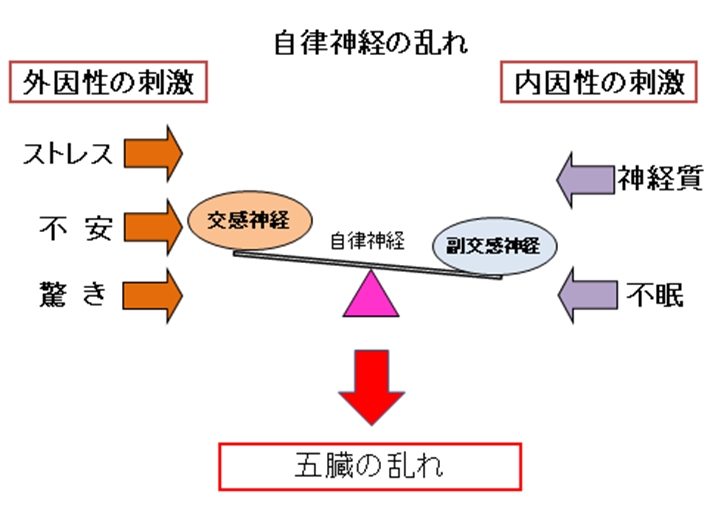 五臓の乱れが生じる原因を現代風に解釈すると、主に自律神経の乱れが原因と思われます。自律神経は、身体を緊張させ能動的に動かす交感神経と、身体を休める副交感神経からなり、この2つがバランスを取ることによって身体も神経も安定しています。