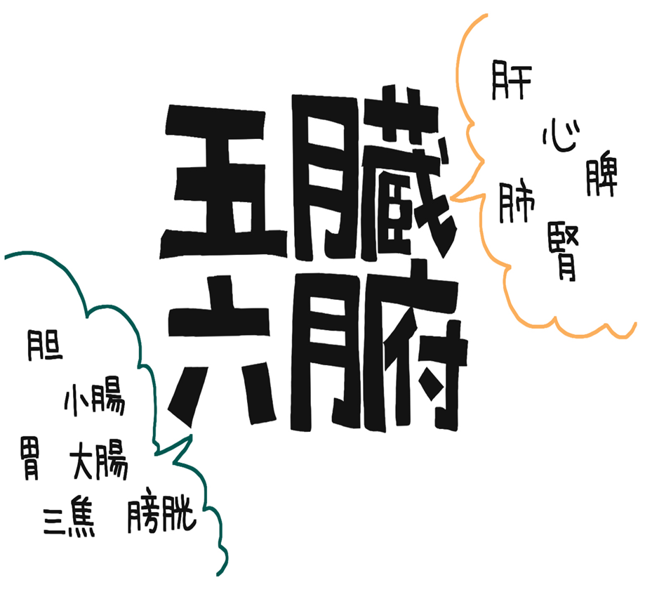 「五臓」とは、肝・心・脾・肺・腎のことを指し、「六腑」は胆・小腸・胃・大腸・膀胱・三焦のことを指します。