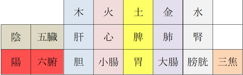 五臓は木=肝、火=心、土=脾、金=肺、水=腎と当てはめられていますが、六腑も木=胆、火=小腸、土=胃、金=大腸、水=膀胱と当てはめ、五臓と六腑は表裏(陰陽)の関係といわれています。