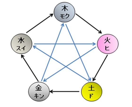 世の中のあらゆるものが五種類の元素(木・火・土・金・水)からなり、その五つが相互に密接な関係をもって互いに影響を与えあい、変化し循環するという考え方です。