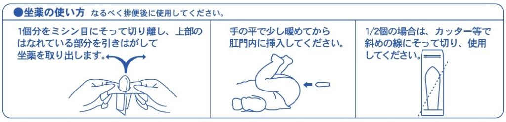 坐薬は、腸から直接吸収されるため、早く効いて胃を荒らさないという特長があります。また、吐き気があるときやせき込みやすい時に適しているといった利点もあります。その一方、紡錘形のお薬を肛門に挿入するという使用方法にあまりなじみがなく、最初戸惑う方もいらっしゃるようです。上手な使用方法としては、コンテナ(坐薬が個包装されたもの)を1個切り離して、コンテナごと手であたためて少し柔らかくしてください。次にコンテナから坐薬を取り出し、バリ(出っ張りなど)があるようでしたら手で押してなめらかにしてください。それから、肛門にワセリン又はオリーブ油などを塗ってください。おむつ交換のときのように足を持って上に持ち上げて、坐薬を肛門に当てて少し力を入れればすっと入ります。