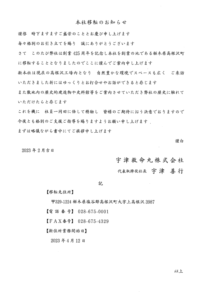 宇津救命丸株式会社(本社:東京都千代田区神田駿河台3-3 代表取締役社長:宇津善行 )は、2023年4月12日に現在自社工場のある栃木県塩谷郡高根沢町上高根沢地内に本社を移転することをお知らせいたします。